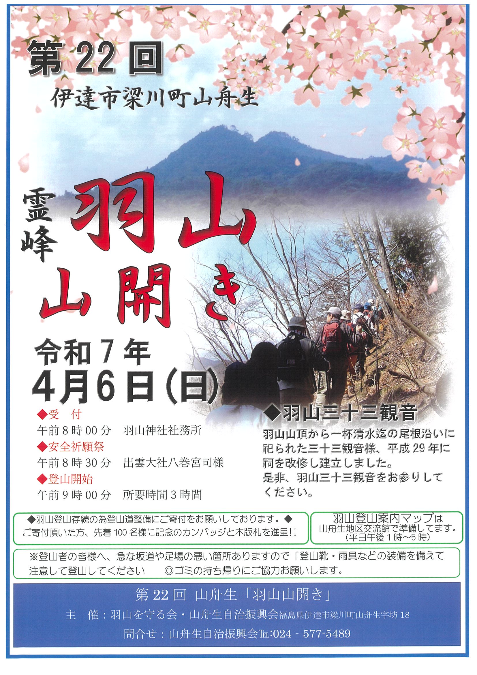- 日時:2025年4月6日日曜日 午前8時00分受付 午前8時30分安全祈願祭 午前9時00分登山開始(所要3時間)