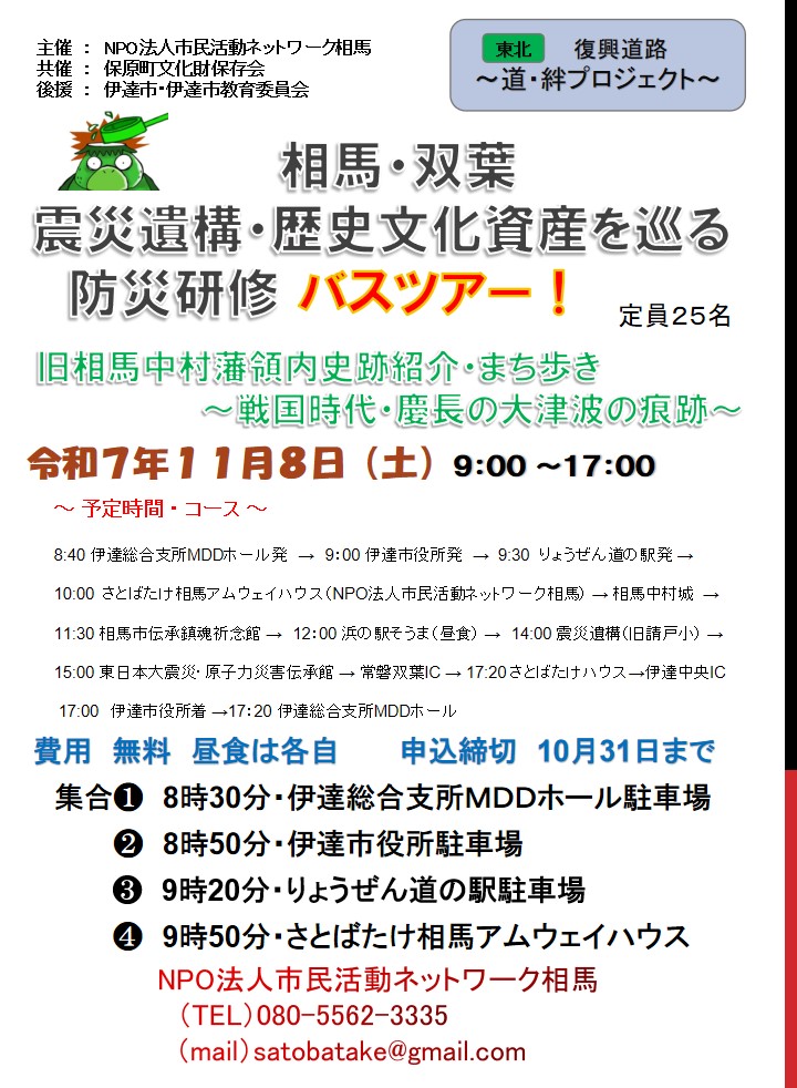 旧相馬中村藩内の史跡紹介とまち歩き、戦国時代・慶長の大津波の痕跡を辿る防災研修バスツアーです。