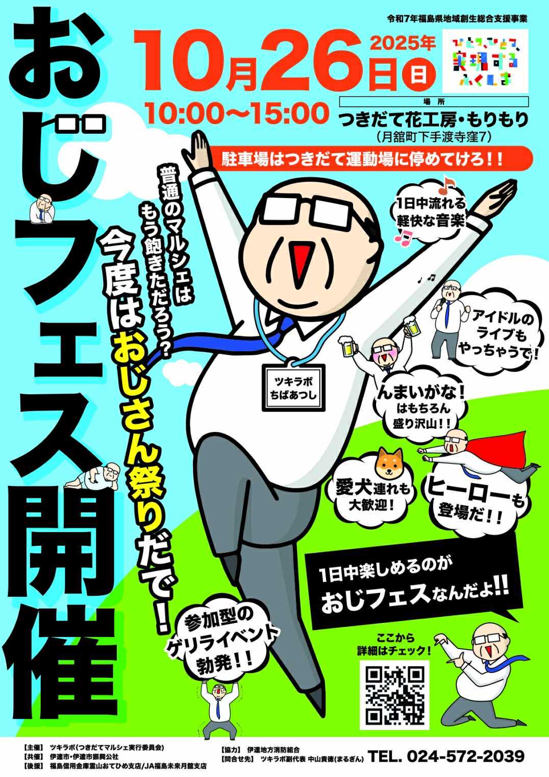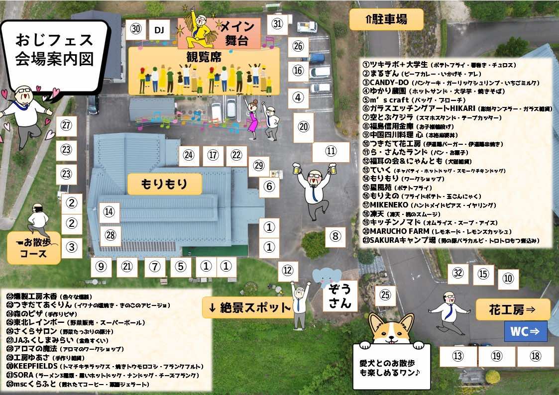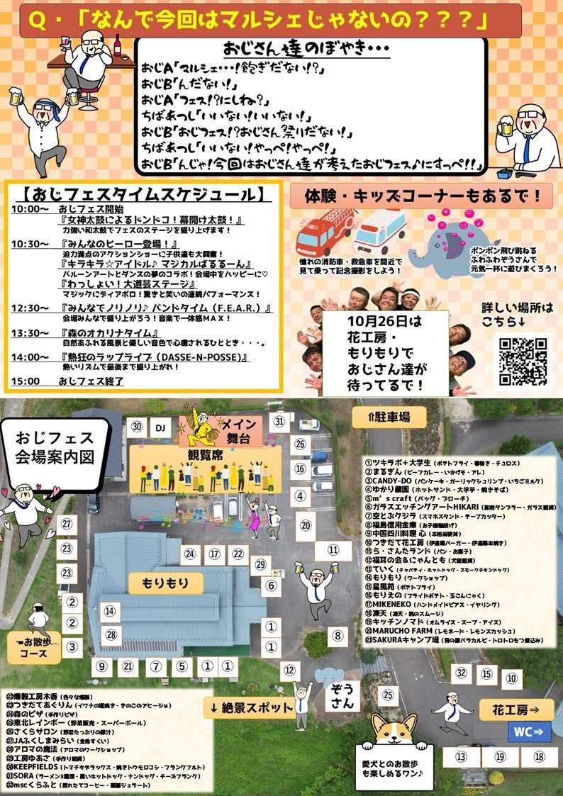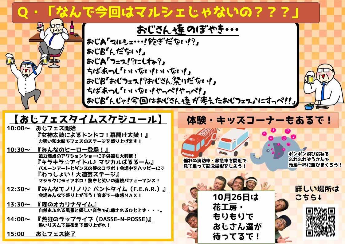 - 内容:一日中楽しめるのがおじフェスなんだよ!!一日中流れる軽快な音楽♪アイドルのライブもやっちゃうで!んまいがな!はもちろん盛り沢山!!ヒーローも登場だ!!愛犬連れも大歓迎!参加型のゲリライベント勃発!!