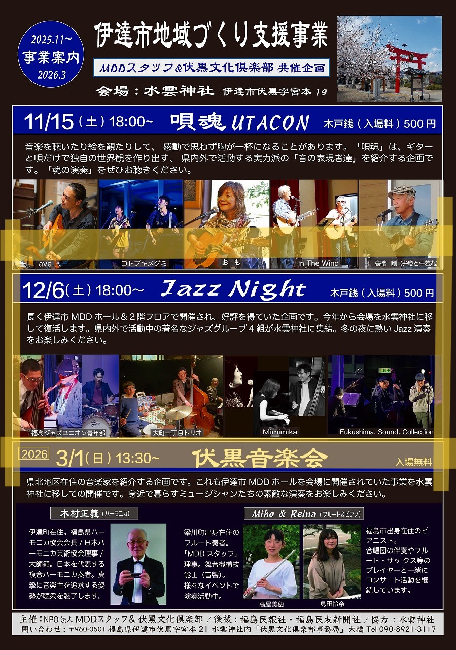 - 出演:福島ジャズユニオン青年部(外部リンクYouTube)、大町一丁目トリオ、Mimimika、Fukushima Sound Collection