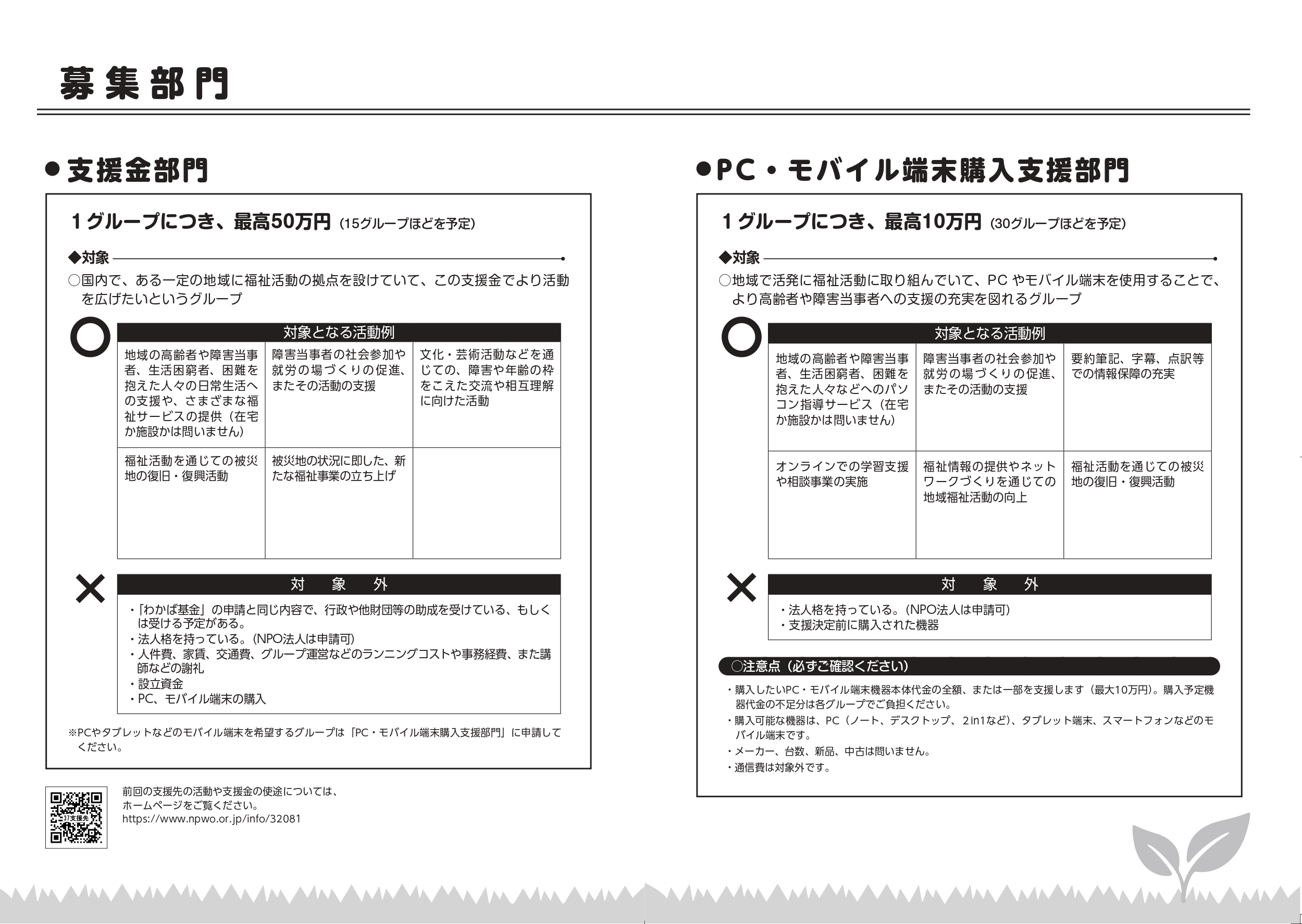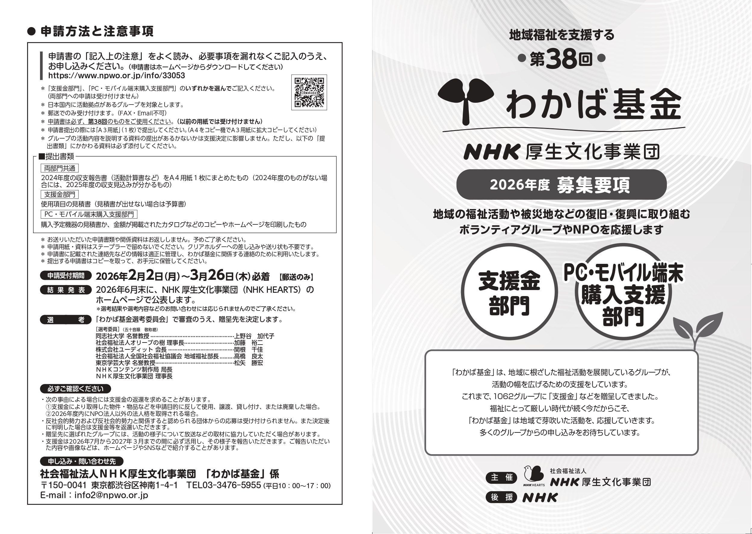掲載日:2026年2月4日 助成金 / Last updated : 2026年2月3日 date-civilsupport センターからのお知らせ 第38回 NHK厚生文化事業団 地域福祉を支援する「わかば基金」募集 掲載情報の詳細は、各助成団体等に直接お問い合わせください。 名称:第38回 NHK厚生文化事業団 地域福祉を支援する「わかば基金」(2026年度)(外部リンク) 実施団体:社会福祉法人NHK厚生文化事業団(外部リンク) 申込受付期間:2026年2月2日月曜日から3月26日木曜日まで ※必着、郵送のみ 募集要項はこちら(PDF:1MB)