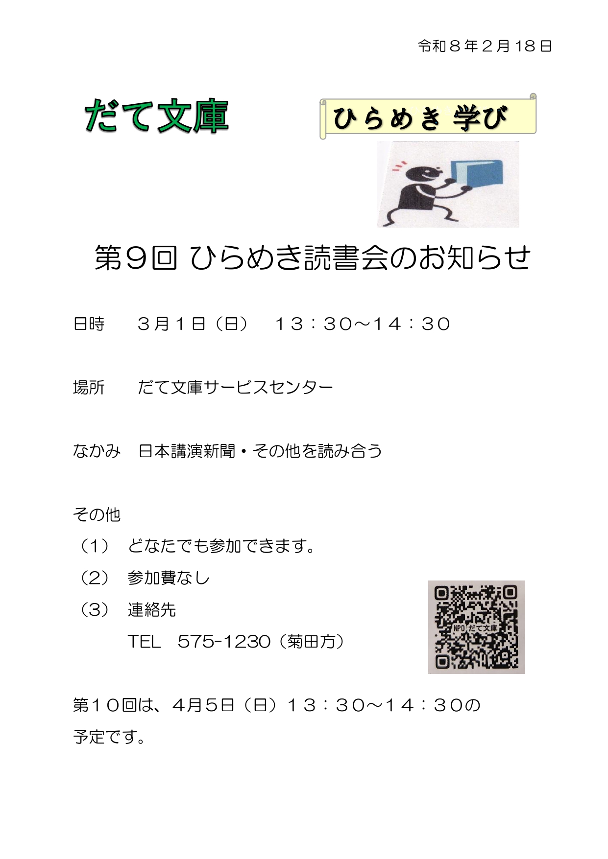 掲載日:2026年2月26日 イベント市民活動 / Last updated : 2026年2月25日 date-civilsupport センターからのお知らせ 3/1 第9回 ひらめき読書会 第9回 ひらめき読書会 どなたでも参加できます。参加無料。 日時:2026年3月1日日曜日 午後1時30分から午後2時30分 場所:だて文庫サービスセンター 福島県伊達市保原町字久保75-1(外部リンクGooglemap) なかみ:日本公演新聞・その他を読み合う 主催:だて文庫サービスセンター 024-575-1230(菊田) 第10回は4月5日日曜日開催の予定です。