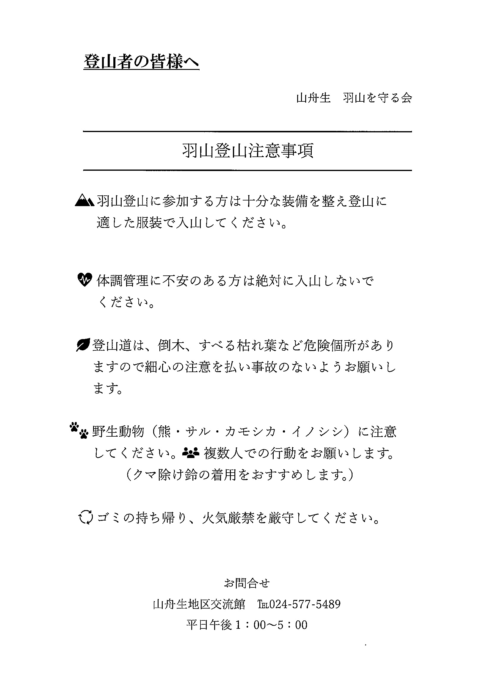 - 主催:羽山を守る会 問合せ:山舟生自治振興会 024-577-5489 ※平日午後のみ