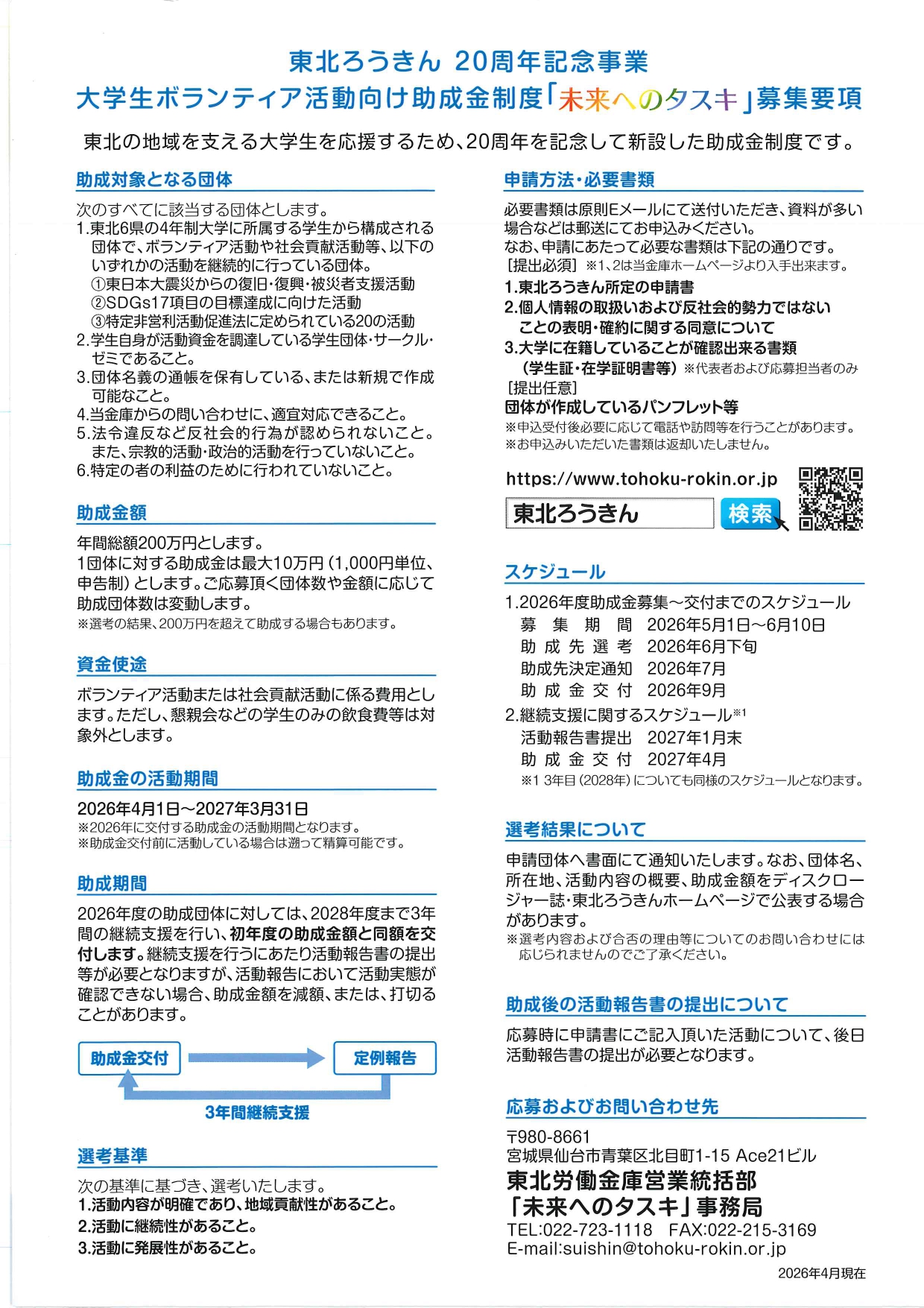掲載日:2026年4月21日 助成金 / Last updated : 2026年4月21日 date-civilsupport センターからのお知らせ 大学生ボランティア活動向け助成金制度 未来へのタスキ 募集要項 掲載情報の詳細は、各助成団体等に直接お問い合わせください。 地域を支える大学生の皆さんを応援します! 名称:大学生ボランティア活動向け助成金制度~未来へのタスキ~(外部リンク) 実施団体:東北労働金庫(外部リンク) 申込受付期間:2026年5月1日金曜日から6月10日水曜日 詳細はこちらから(外部リンク)